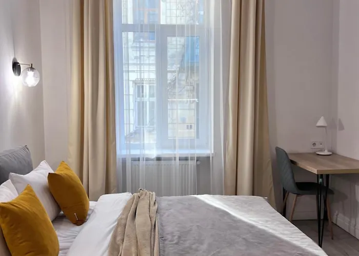 La propiedad dispone de servicio de tetera/cafetera y una cocinilla bien aprovisionada con cafetera. El aeropuerto Internacional de Leópolis está a 15 minutos en coche, y la parada de autobús Kniazia Romana, a un minuto del apartamento.